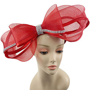 Introducing our radiant Sunday Fascinator 283HB, a stunning accessory designed to turn heads at your next sophisticated event. Crafted with precision, this fascinator boasts a vibrant red hue, accentuated by an eye-catching bow that embodies both elegance and playfulness. The bow's intricacy, coupled with sparkling rhinestone embellishments, creates a shimmering effect that elevates any ensemble to a celebratory level.