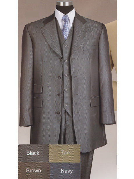 This suit features a classic single-breasted jacket, a matching vest, and trousers, each piece meticulously tailored to present a sharp silhouette. The fine details, such as the flap pockets and button accents, showcase the suit's quality craftsmanship. Whether it's for a wedding, business meeting or sophisticated social gathering, this garment will ensure you stand out with a timeless yet modern style. Additionally, it comes in an array of colors to suit any preference â choose from Black, Tan, Brown, or Navy to best suit your personal style and occasion.