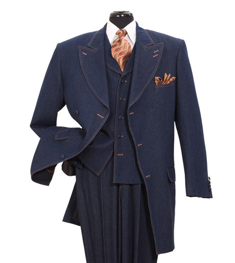 Introducing the exquisite 5283V-D, a stellar addition to the wardrobe of the discerning gentleman. Crafted from a premium fabric that mimics the finish of denim, this three-piece ensemble offers both elegance and durability. The classic navy hue is enhanced by the subtle contrast stitching that outlines the contours of the suit, adding an air of distinction.