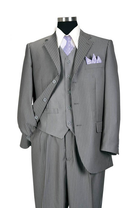 Introducing the 5802V3K-GY, a representation of sartorial elegance and contemporary style. Crafted from premium quality fabric, this three-piece suit is an epitome of tailoring excellence. The gray color scheme provides a versatile foundation for a variety of formal and business occasions, while the subtle striped pattern offers an element of texture and depth to this classic ensemble.