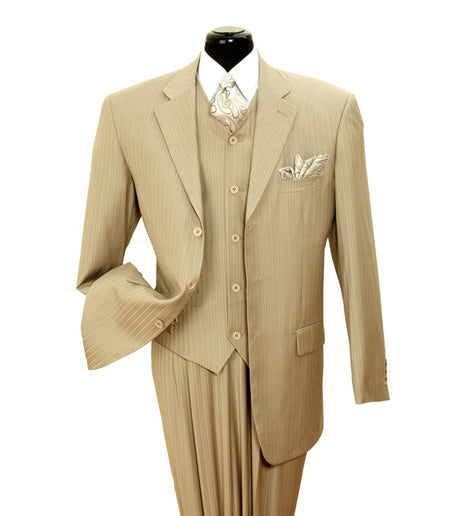 Presenting our exquisite 5802V4K-TAN suit, a sartorial masterpiece designed for the modern gentleman who appreciates timeless elegance with a contemporary twist. Impeccably tailored to highlight a man's physique, this ensemble stands out with its subtle yet commanding pinstripe pattern that elongates the silhouette, creating a slimming and sophisticated profile.