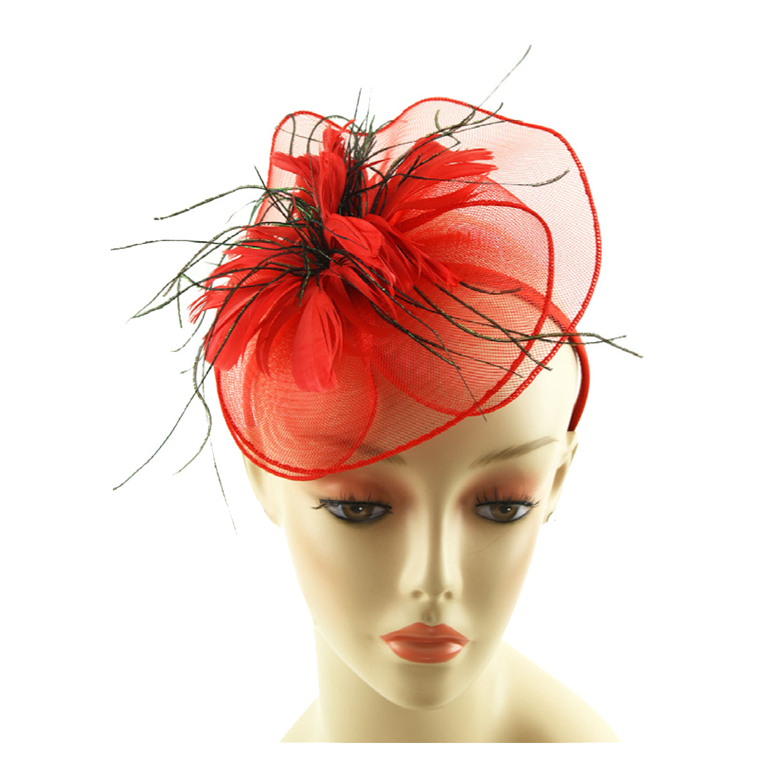 Introducing the stylish "8010 Ladies Church Fascinator," a statement piece that exudes class and sophistication. This captivating fashion accessory in a bold red hue is the perfect choice for any lady aiming to add a touch of elegance to her church attire or for guests looking to stand out at a wedding or high-profile event. Crafted with meticulous attention to detail, this fascinator features a tasteful blend of feathers and netting, positioned beautifully to create a stunning visual impact.