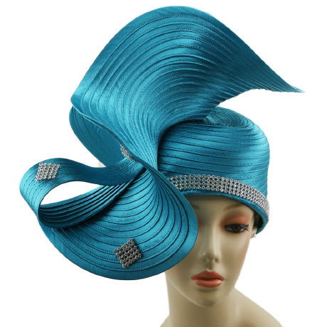 The vivid turquoise color, chosen for its universally flattering properties, adds a pop of color that brightens any attire and complements a wide range of complexions. The satin finish of the fabric catches the light beautifully, enhancing the hat's overall luxurious appearance.