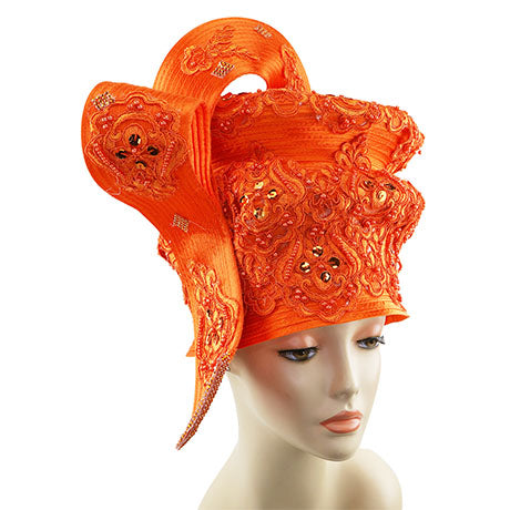 The design features intricate decorative details that exude sophistication, with embellishments that catch the light and draw the eye. The vivid orange hue is not only eye-catching but also versatile enough to pair with various outfits for a perfectly coordinated look. Whether attending a service or a formal gathering, this hat is sure to turn heads.