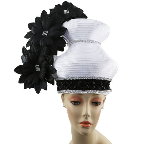 Our carefully crafted hat is made with high-quality materials that ensure durability and a long-lasting experience. The hat's body is wrapped in a smooth, luxurious fabric with a subtle sheen that catches the light with grace. Accentuating the beauty of this striking hat is a bold floral adornment, meticulously designed to add a flourish of elegance to your ensemble. This beautiful arrangement is coupled with sparkling embellishments that give a nod to traditional church millinery while infusing a contemporary touch.