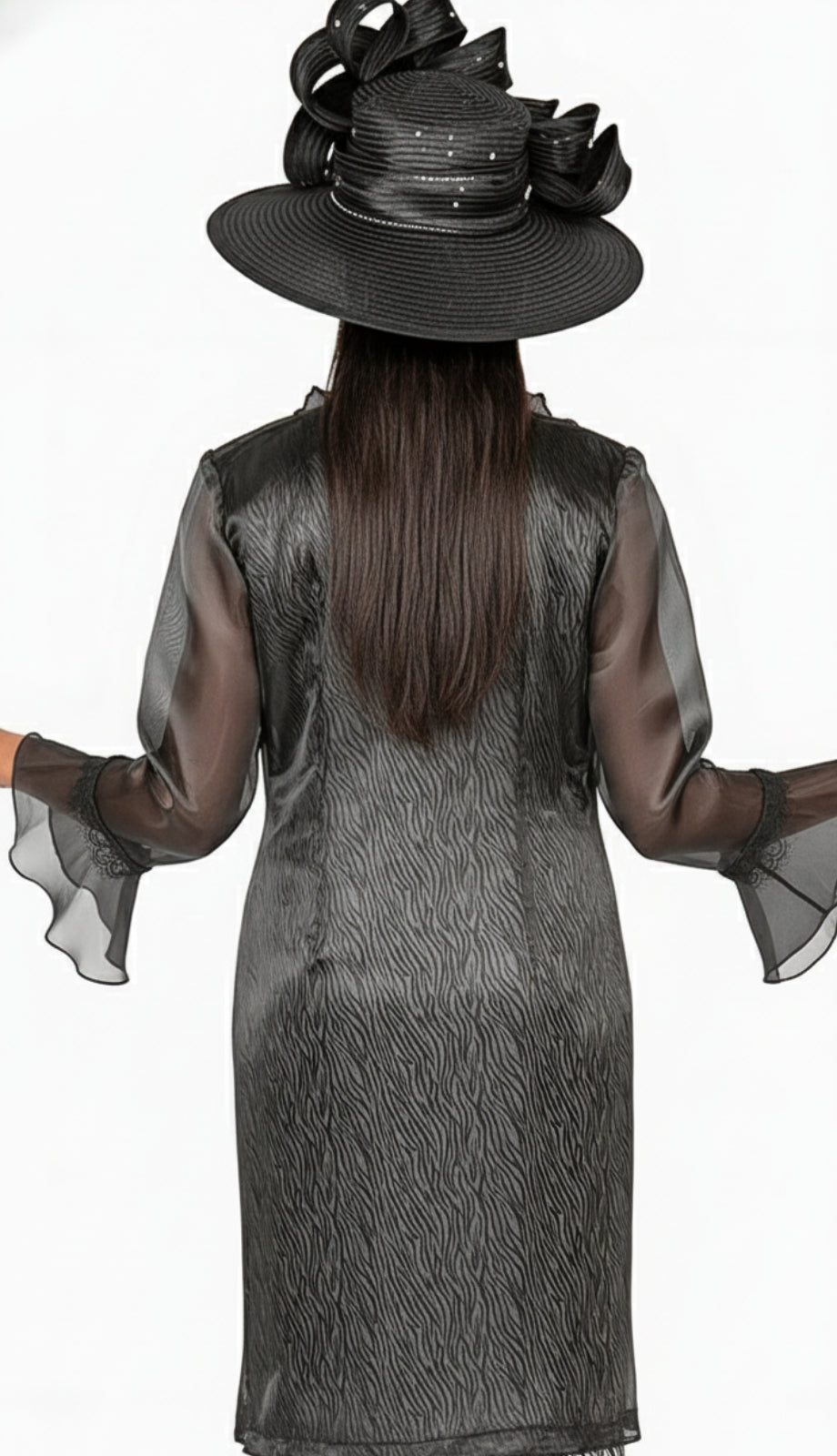 At the center of the design is an accentuated waistline, highlighted by a decorative buckle that both cinches the waist and serves as a focal point, adding definition to the silhouette. The overall effect is one of poise and refinement. With the Aussie Austine 5672 Church Dress, every woman can feel confident and distinguished, knowing she is dressed in a way that is both respectful and fashion-forward. While hats are often paired with church attire, please note that hats are sold separately and are not included with this dress.