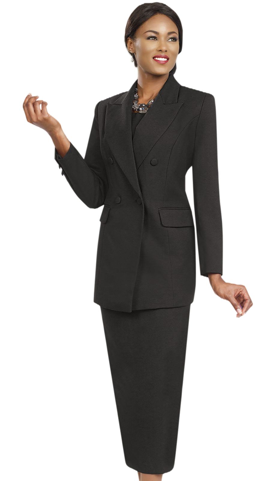 The suit features a classic double-breasted jacket which immediately conveys a sense of formality and poise. The thoughtfully placed buttons accentuate the sharp design, while the discreet pockets provide functionality without disrupting the sleek silhouette. Accompanied by a formal skirt that reaches knee length, the suit is designed to offer ease of movement, courtesy of the back vent, while maintaining a proper and austere aesthetic.