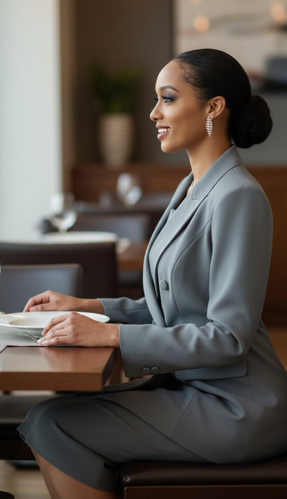 The accompanying pencil skirt complements the jacket with its sleek and uncluttered design, finishing the look with an air of understated professionalism. It's cut to a modest length to ensure ease of movement without sacrificing style. The fabric chosen for both pieces prioritizes comfort, making sure that you can wear this suit throughout the day without any constraints on your movement or style.