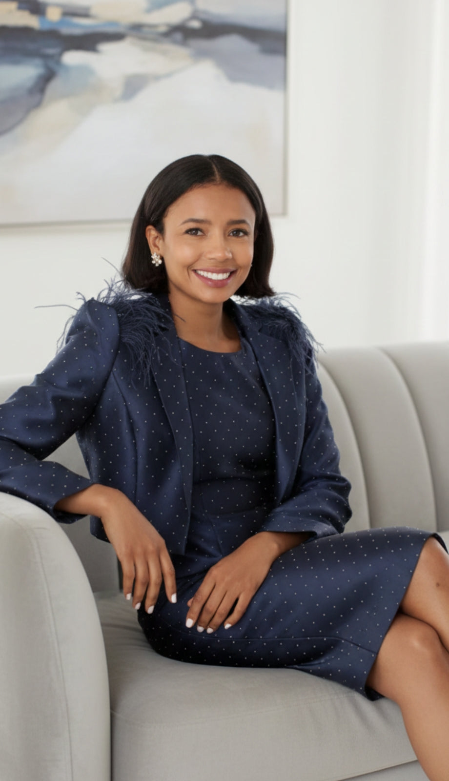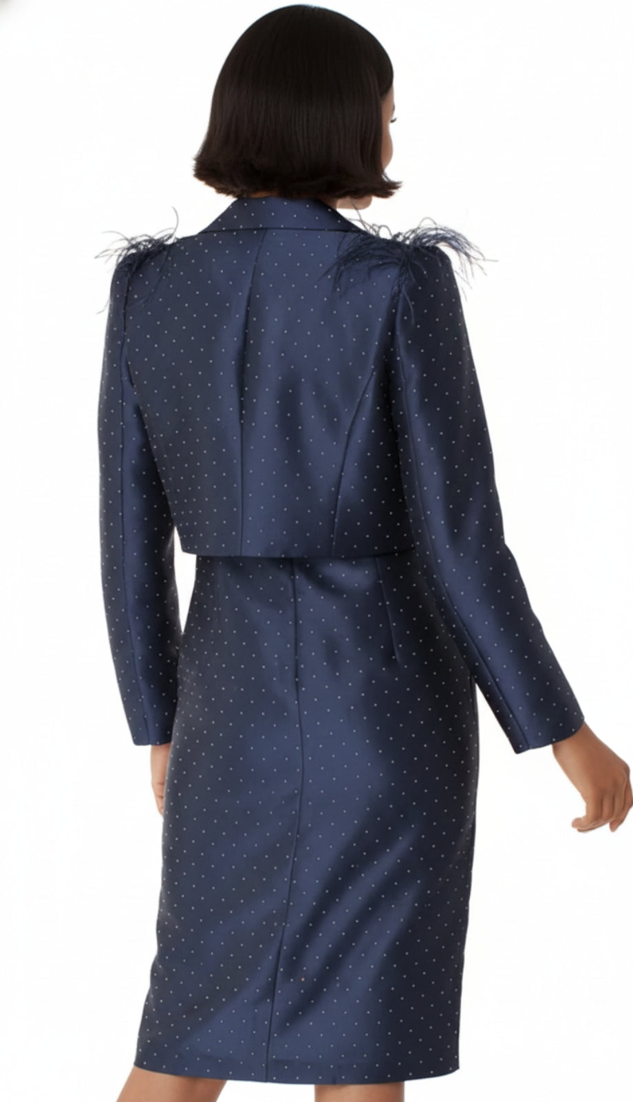 • 2pc Dress And Sleek Jacket Set With Studded Rhinestones In A Polka Dot Design Along with Feathered Shoulders