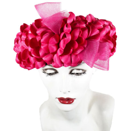 Introducing the Church Hat RING A, a stunning piece of craftsmanship designed to add a touch of elegance and sophistication to your wardrobe. This exquisite hat boasts a rich fuchsia color that radiates confidence and style. Crafted with the highest quality materials, the hat features an array of beautifully arranged flowers that create a captivating visual effect, sure to turn heads at any event.