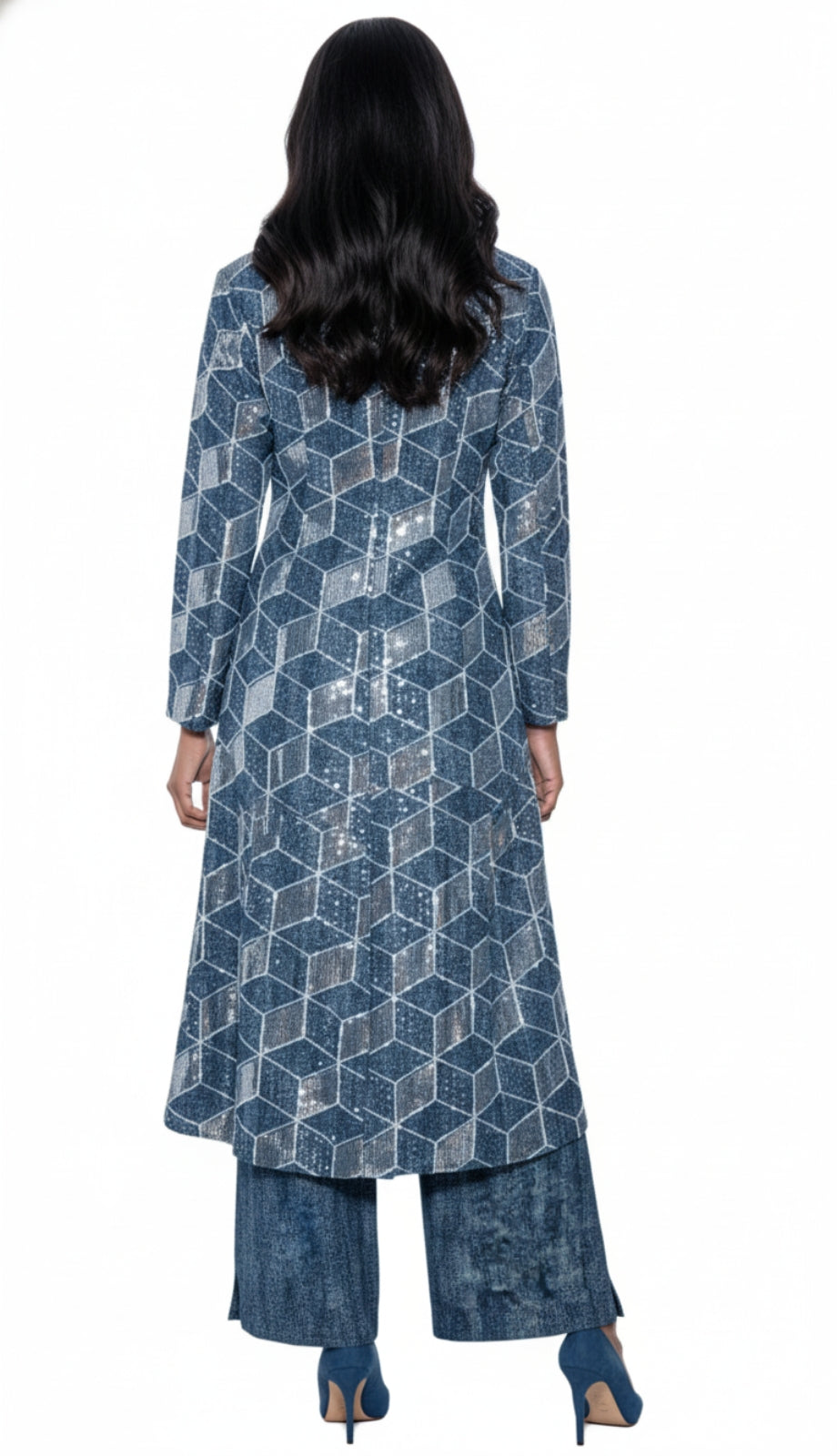 The top portion of this suit features a delightful sleeveless design that offers both comfort and a sleek silhouette, allowing for ease of movement and a flattering fit. Paired with the top, the jacket is a true statement piece. The elongated collar and tastefully detailed geometric pattern add a touch of modern flair. The delicate button closure provides both functionality and aesthetic appeal, harmonizing the ensemble with a polished finish.