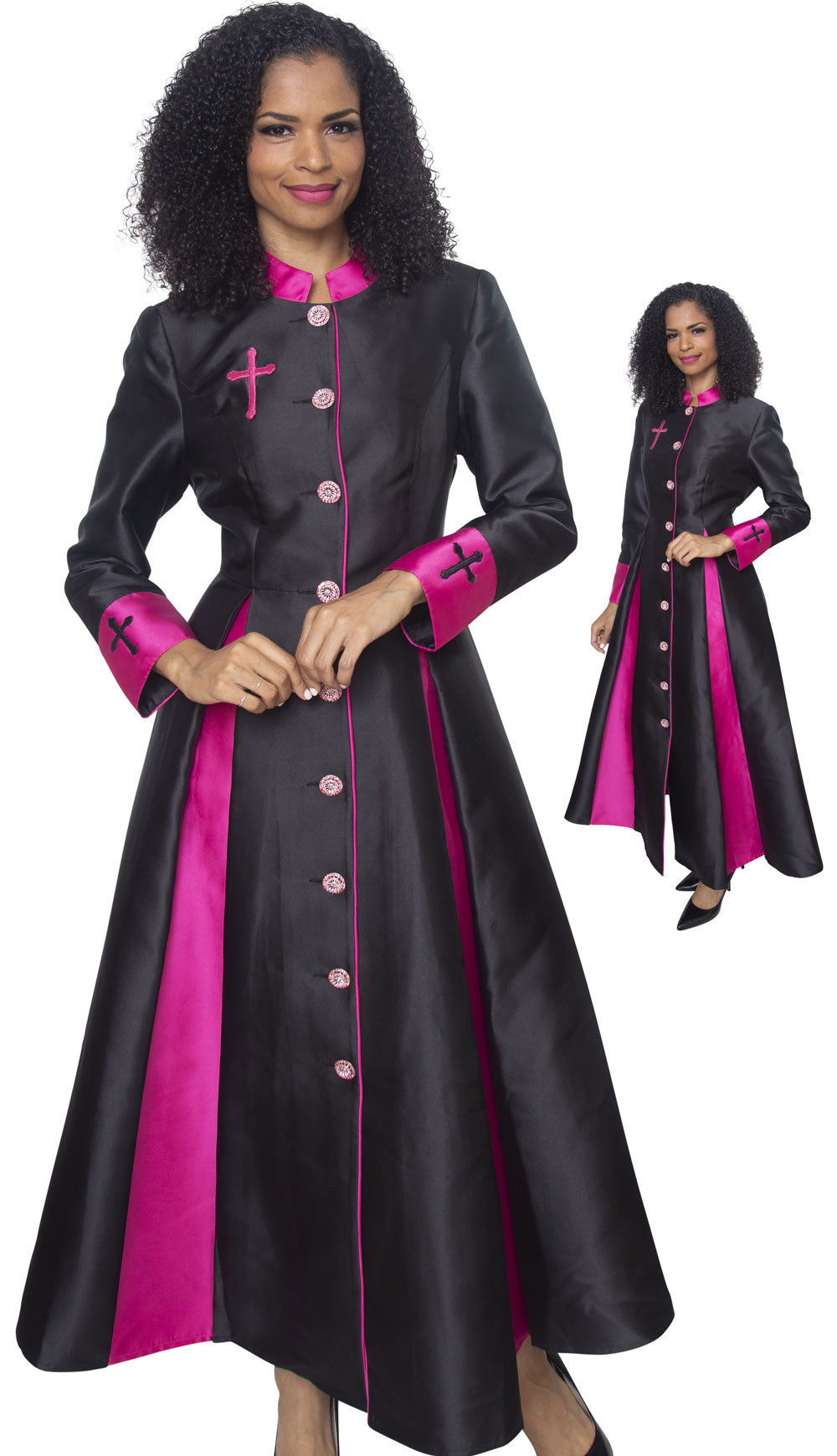 The dress features a classic A-line silhouette which gracefully skims the body, making it flattering for a variety of body types. Its full-length cut also resonates with the formality of church ceremonies and events. Craftsmanship is evident in each detail, from the bold piping along the edges that provide a striking contrast to the luxurious black fabric, to the unique cross-shaped button accents that add an element of subtle charm.