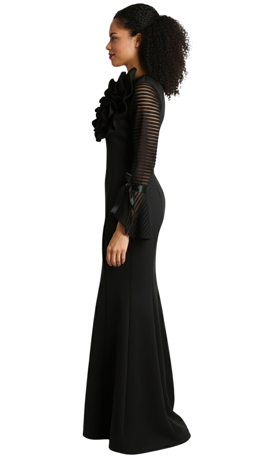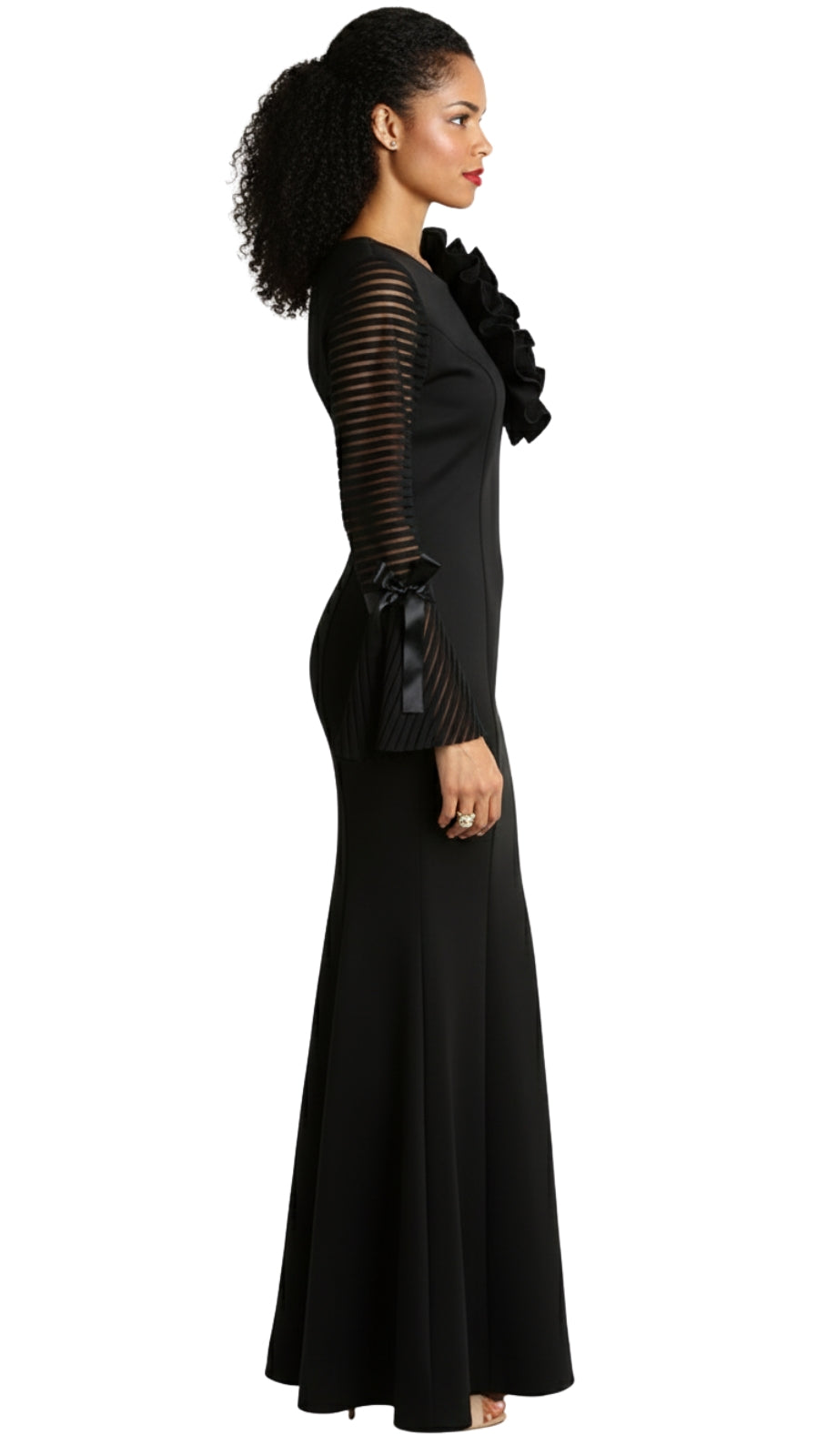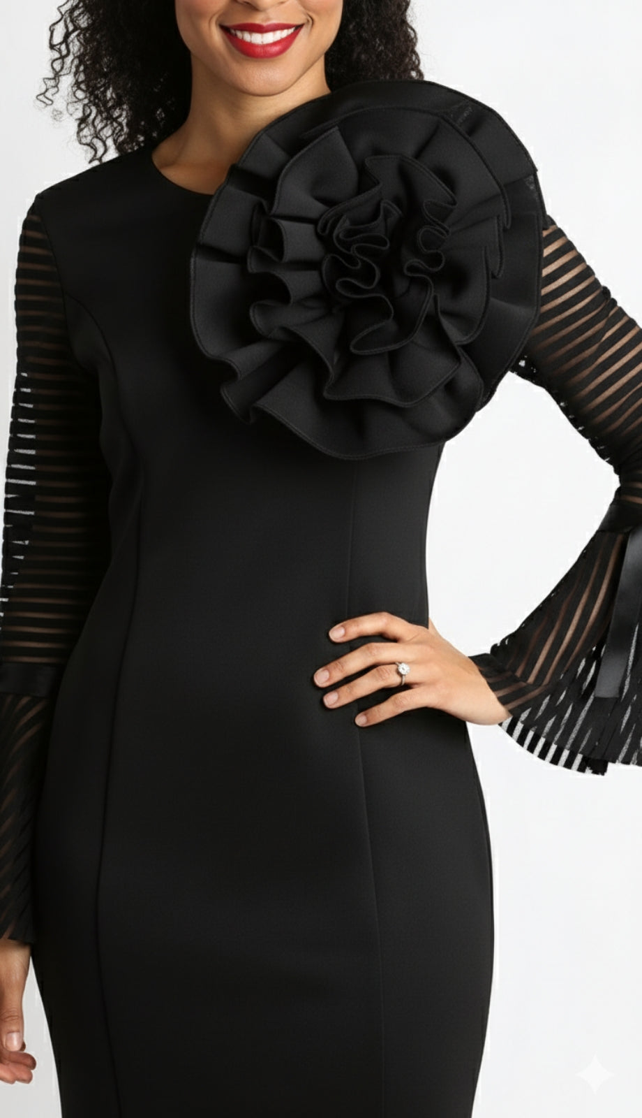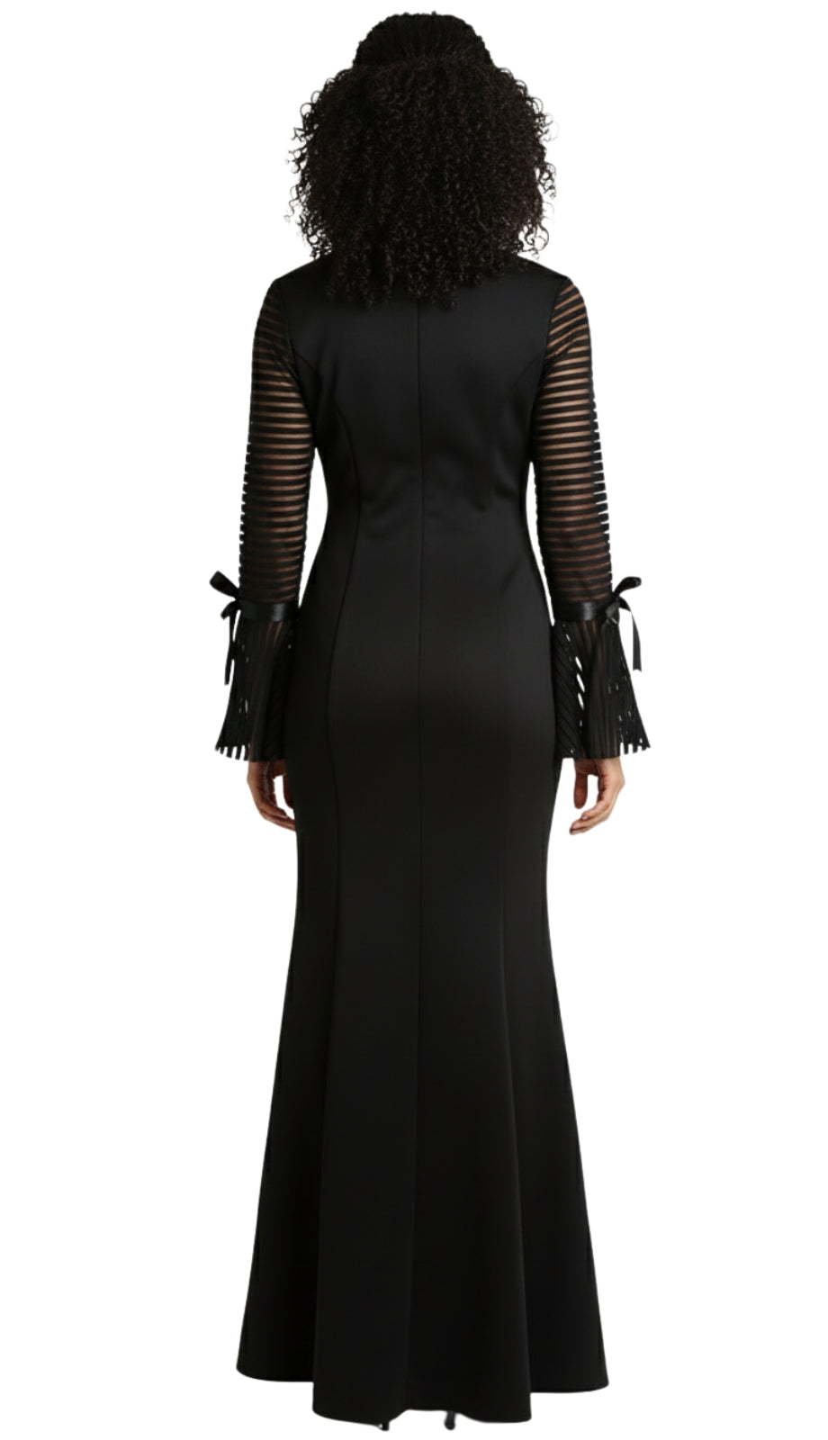 The dress features an exquisite form-fitting silhouette that gracefully accentuates the curves, gently flaring into a demure hemline. This subtle flare adds a touch of classic glamour and ease of movement, making it as practical as it is fashionable. Long sleeves with unique sheer panel accents not only add to the visual appeal but also provide coverage suitable for a range of personal styles and religious observances.