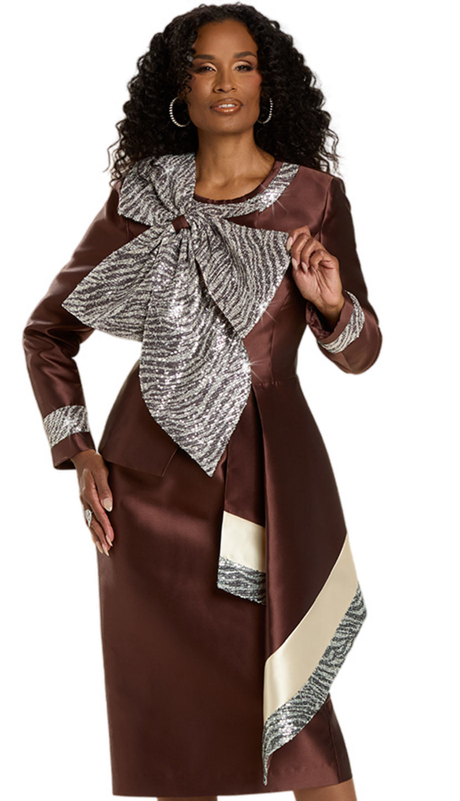 Introducing the Donna Vinci 12145 Church Suit, a masterpiece of sartorial elegance designed for women who appreciate a blend of classic style with contemporary flair. This exquisite ensemble features a chocolate brown color palette, evoking a sense of warmth and sophistication that is second to none. The mixed fabric design showcases a captivating contrast between the smooth, solid-hued base and the shimmering, textured accents, which add a touch of opulence and visual interest.