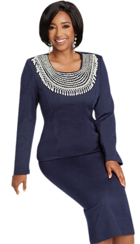 The focal point of this beautiful navy suit is the ornately decorated neckline, which features meticulous beadwork and imitation pearl accents, offering a touch of glamour without the need for additional accessories. The bead and pearl embellishments are handcrafted, ensuring that each piece is not just a garment but a work of art.
