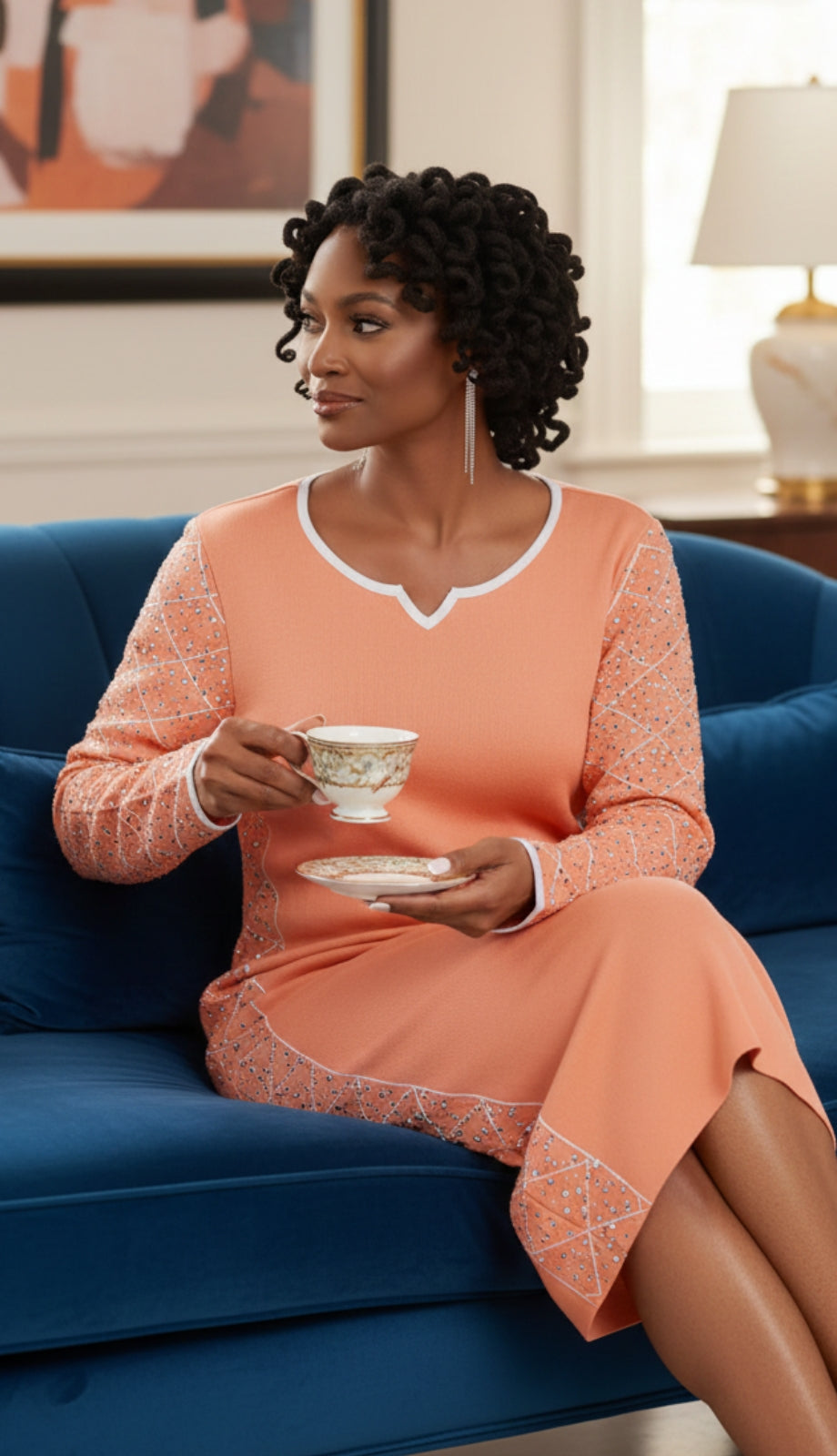 Introducing the exquisite Donna Vinci 13414 Women's Church Dress, a stunning piece that combines sophistication with comfort. Designed for the fashion-conscious woman, this dress features a peach-toned palette that complements its graceful, knee-length silhouette. The fabric is carefully selected to ensure it skims the body in the most flattering way, while also providing enough stretch to allow for free movement, ensuring that you look composed and at ease at any formal gathering.