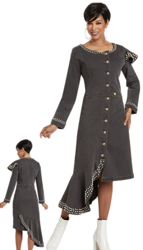 Introducing the DV Jeans 8450 Church Dress, a chic and contemporary addition to your sophisticated wardrobe. Crafted with quality denim, this dress exemplifies durability and comfort while ensuring a polished look for any formal setting or Sunday service. The dress's unique mid-length cut paired with an asymmetrical hemline offers a modern twist on classic elegance. Attention to detail is evident through the exquisite button embellishments that line the front and sleeves, adding a subtle charm without overpowering the garment's simple grace.