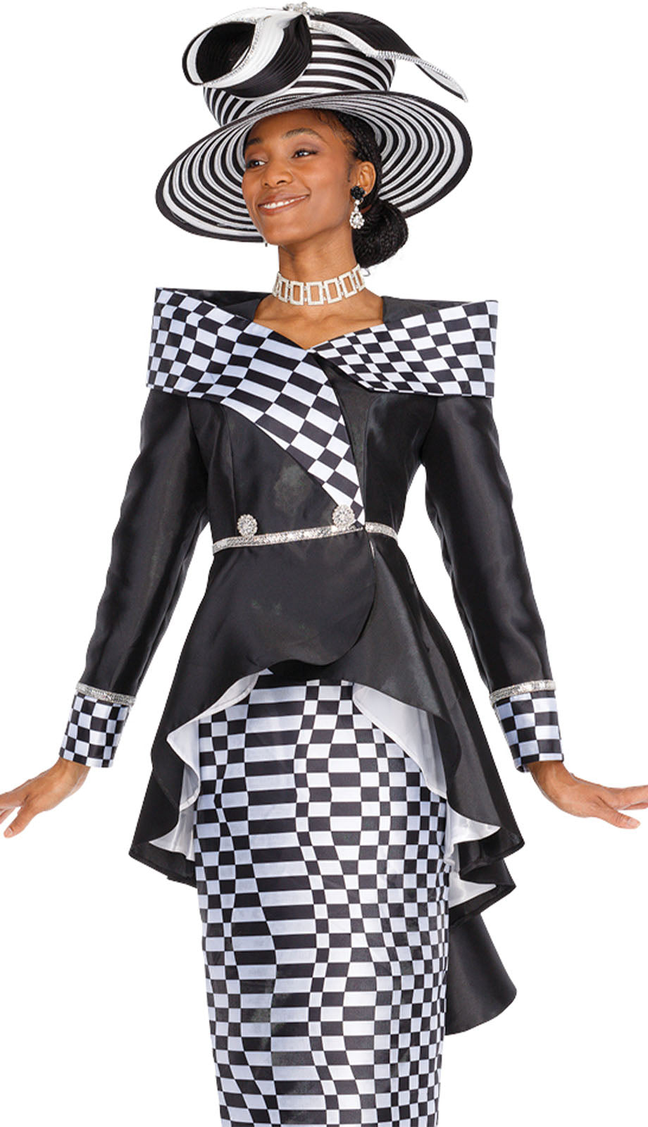 Discover sophistication with the Elite Champagne 6159-H, an attire that exudes confidence and style. This fashion statement piece is designed for individuals who demand both elegance and a touch of daring in their wardrobe. The bold, checkered pattern is not only eye-catching but lends an air of modernity to traditional styling, making it an ideal choice for various social events and special occasions.