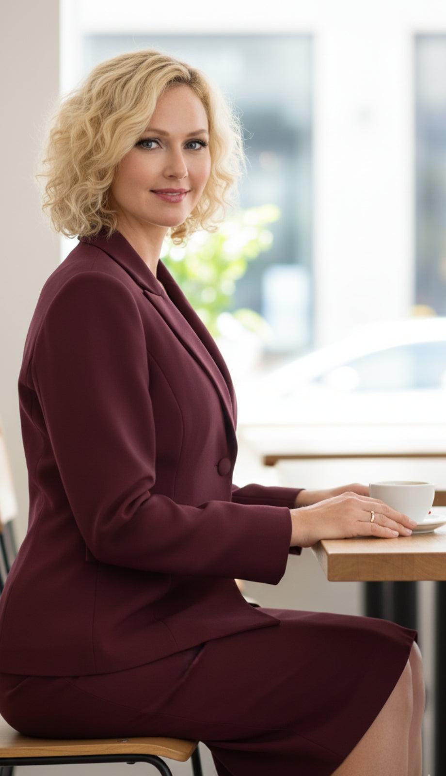 The two-piece ensemble includes a beautifully tailored blazer that features a traditional notch lapel, giving it a timeless appeal that commands respect and admiration. The blazer is designed with a flattering structured fit that accentuates the waist while providing comfort for long days. Functional front flap pockets add a practical and stylish element to the overall design.