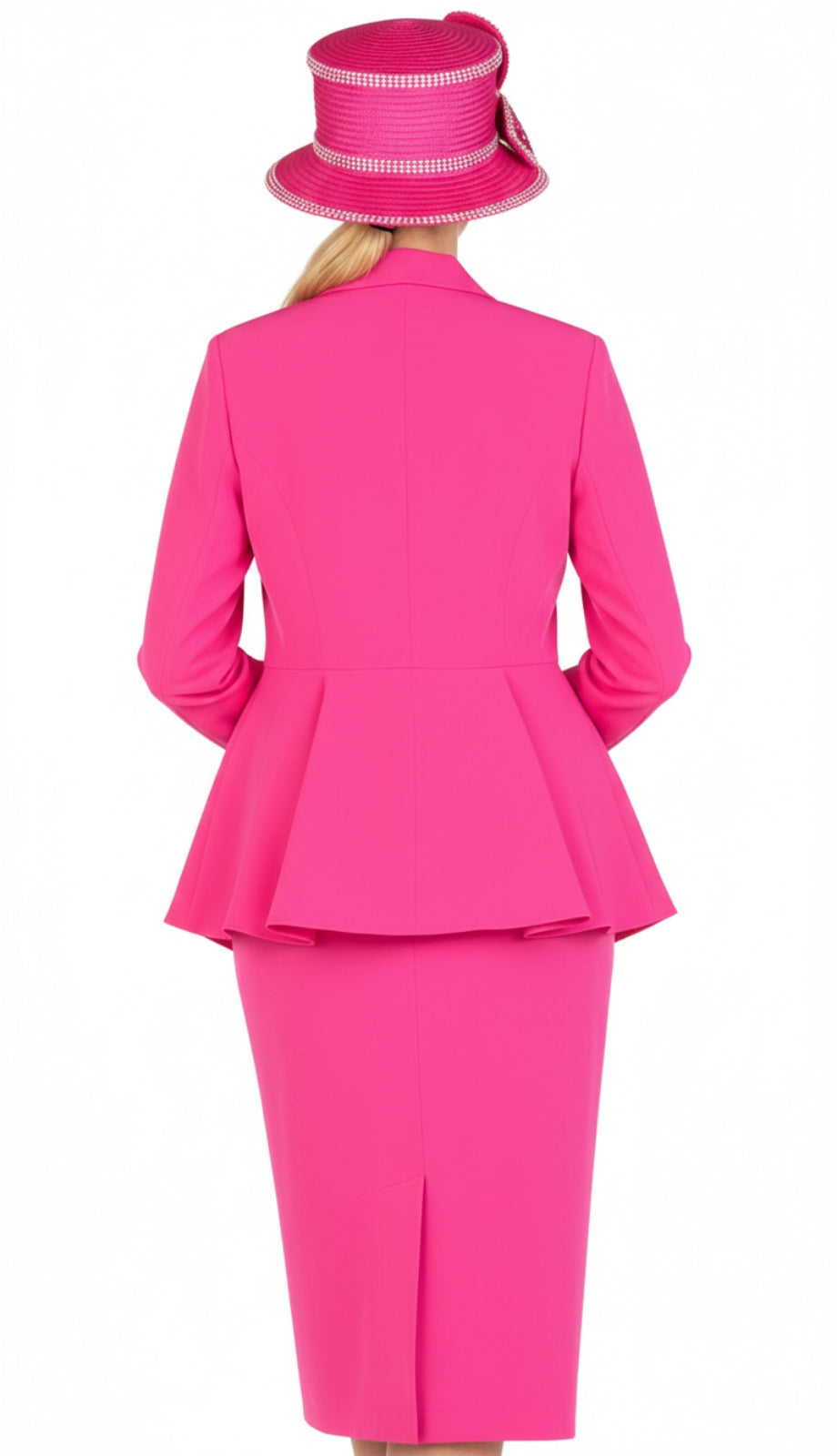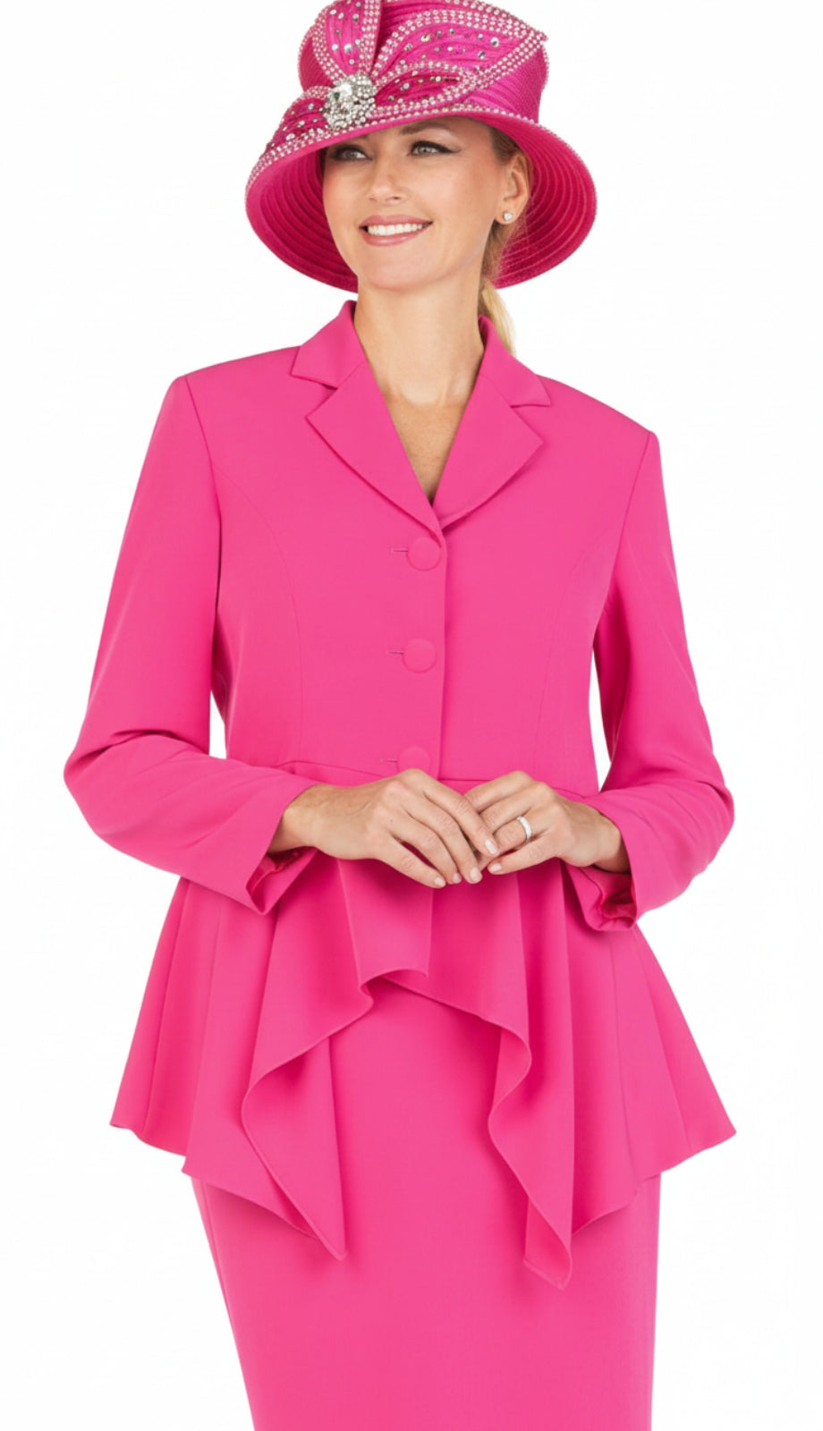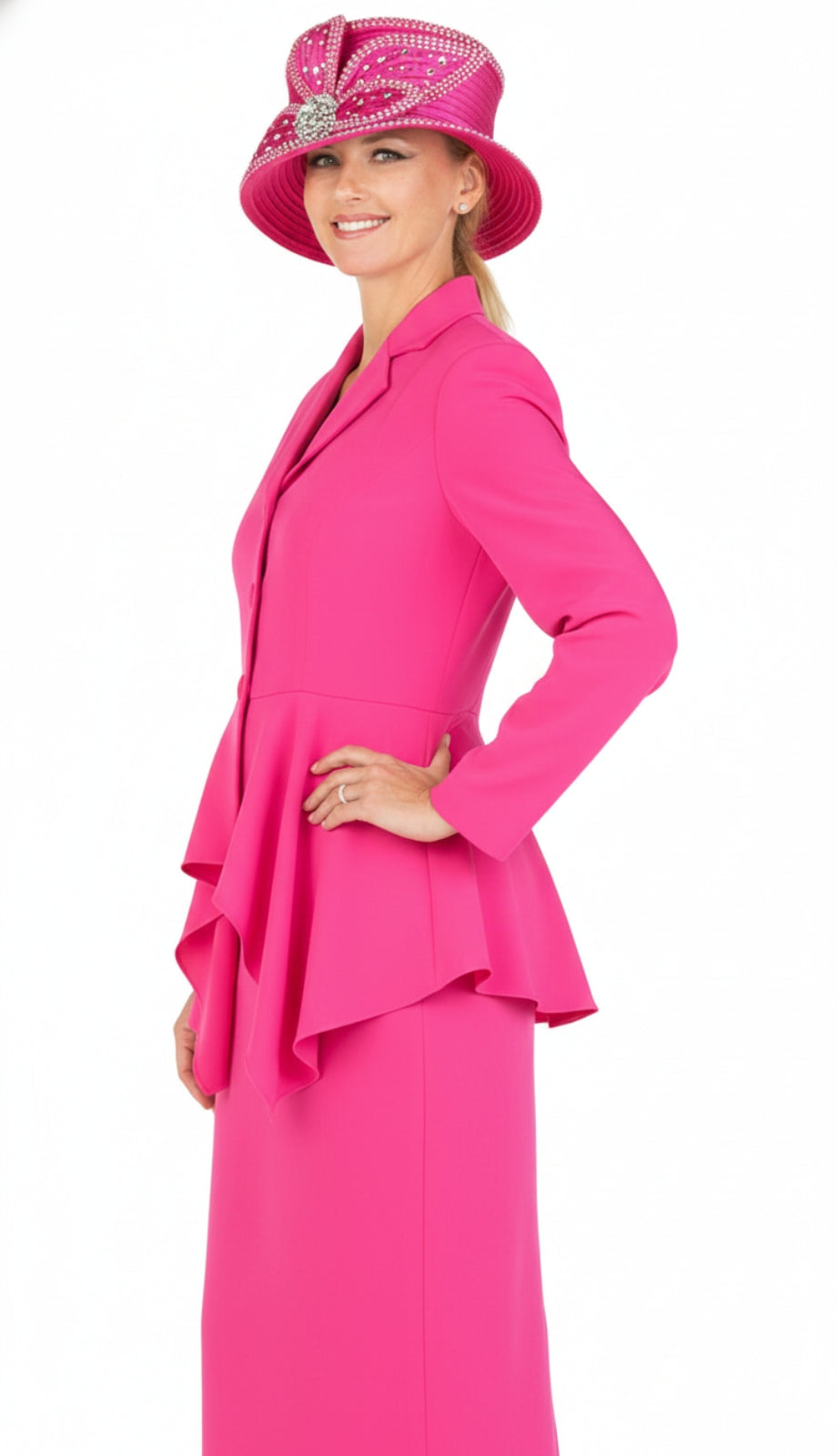The jacket features a beautifully tailored design that achieves a polished and flattering silhouette. The peplum detailing adds a modern twist to the suit, enhancing the waistline and providing a sophisticated flair that transcends trends. Paired with the perfectly cut knee-length skirt, the ensemble evokes a timeless elegance, making it a versatile option for various formal occasions besides church, including conferences, weddings, and more.