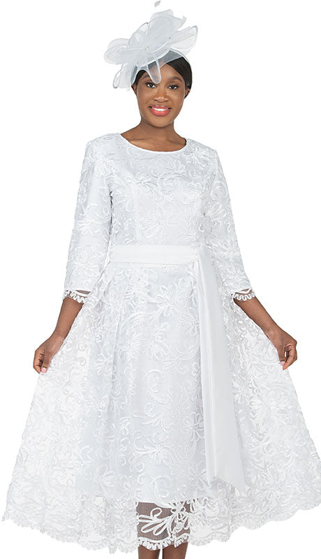 Accentuating the midsection, a luxurious satin waistband enhances the wearer's silhouette, leading to a full skirt that gently sweeps around the knees. The skirt is finished with a stunning scallop hem detail, adding an extra layer of refinement. Whether attending a church service, a wedding, or a formal gathering, the Giovanna D1561 Church Dress is an impeccable choice that exudes class and decency without the need for additional accessories such as a hat.