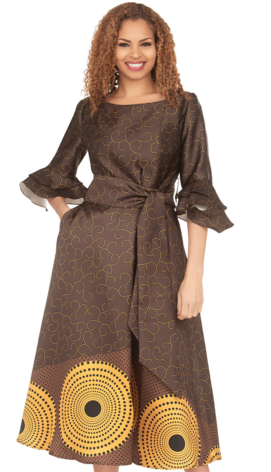 The Giovanna D1587-CHOC Ladies Church Dress is the epitome of elegance and style. Designed specifically for church and formal events, this stunning dress features a sophisticated silhouette that flatters the figure beautifully. Its rich chocolate brown color adorned with striking yellow patterns adds a touch of vibrancy, making it a perfect choice for any special occasion.