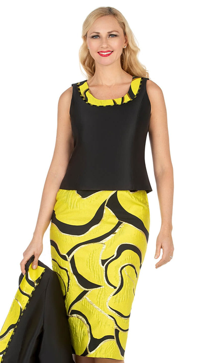 Introducing the striking Giovanna G1170 Church Suit a stunning ensemble designed for the modern woman who appreciates elegance and an eye-catching style. The two-piece outfit boasts a dynamic abstract pattern that draws the eye and complements the sophisticated silhouette of the suit. The vibrant yellow and black color scheme radiates confidence and grace, making it a dazzling choice for any church event or special occasion.
