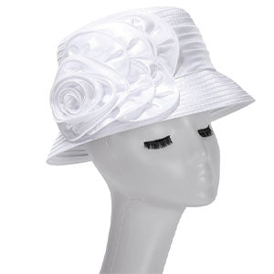 Made with premium materials, its durable construction ensures that it maintains its elegant shape and appeal wear after wear. The hat's brim offers both style and functionality, shielding the face from the sun's rays during outdoor events. Each hat features a unique, luxurious floral accent at the front, making it a standout accessory that catches the eye and completes your ensemble with unmatched elegance.