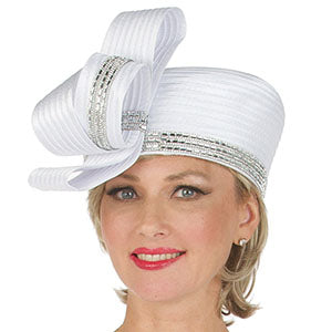 Introducing the Giovanna HR22123-WHT, a model of sophistication and elegance. This hat is the epitome of fashion-forward style, designed specifically to complement your church and special event attire. The striking white color serves as a perfect canvas for the stunning ribbon adornment, which is tastefully embedded with sparkling rhinestones, giving the wearer a glamorous yet refined look.