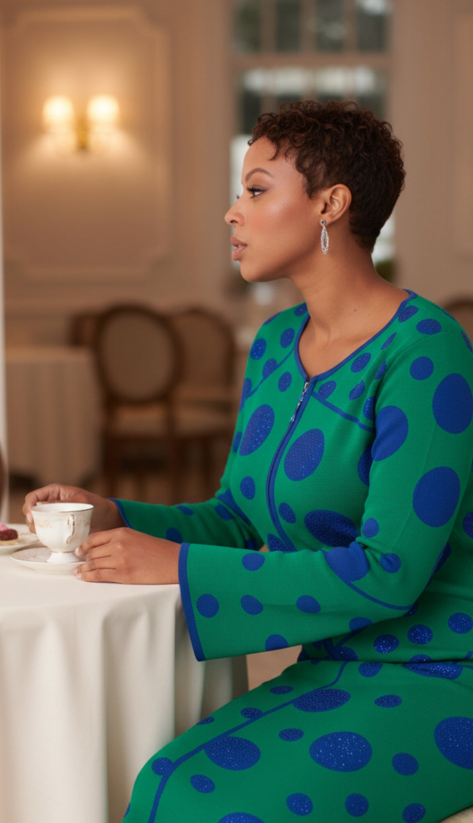 The standout feature of this ensemble is its bold polka-dot pattern, which injects a fun and vibrant energy into the elegant design. The contrast of the vivid hues with the playful pattern creates a look that is undeniably striking, perfect for those who wish to make a lasting impression. Whether you're attending a church service, a formal gathering, or a celebratory event, the Kayla by Tally Taylor 5343-EWB Church Suit is sure to turn heads and affirm your sense of style.