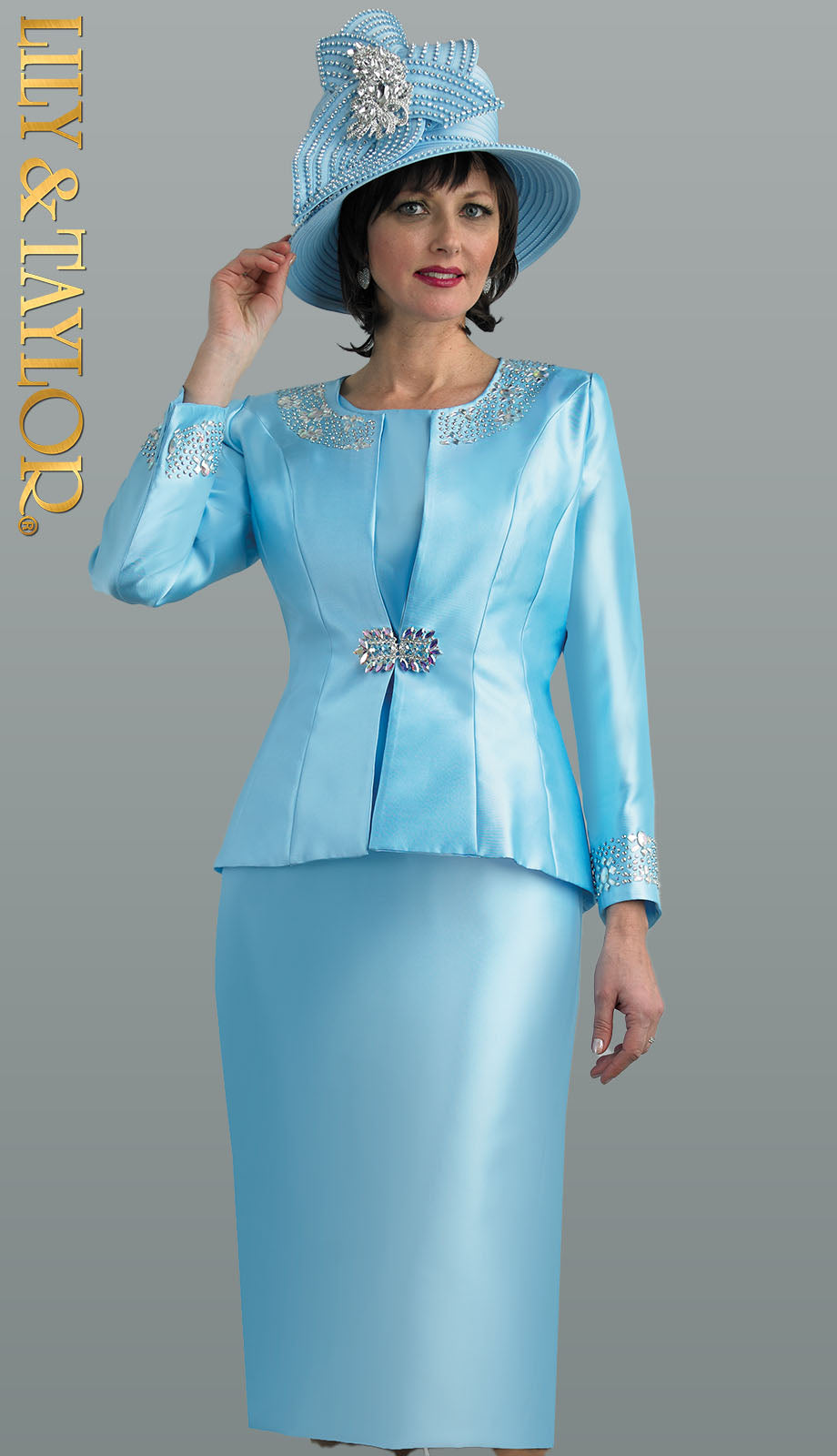 Introducing the sophisticated Lily and Taylor 3800-BLU Ladies Church Suit, designed for the modern woman who appreciates style and elegance. This stunning two-piece ensemble features a luxurious satin fabric, offering a subtle sheen that exudes class and sophistication. Showcasing a mesmerizing shade of blue, this suit is sure to make a statement at any event or religious service.