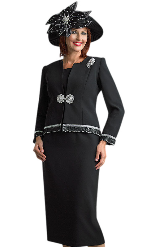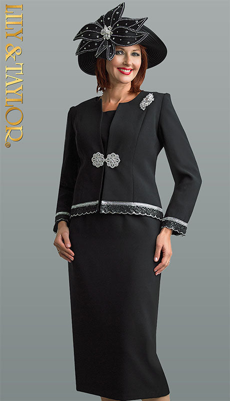 Introducing the exquisitely designed Lily And Taylor 4272-BLK Church Suit, a must-have for any woman seeking a blend of sophistication and timeless style. This luxurious three-piece suit is meticulously crafted to convey an aura of elegance and respectability, perfect for church services, weddings, and formal events.