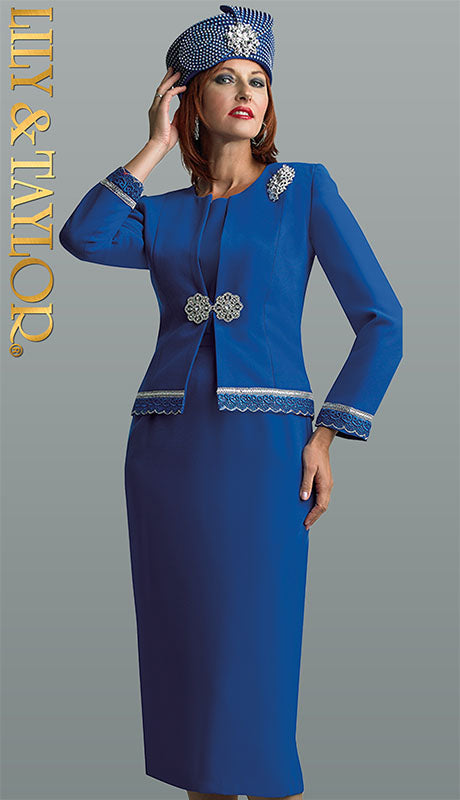 The Lily And Taylor 4272-RYL Church Suit is the epitome of elegance and grace, designed to make a statement at any upscale event. This stunning ensemble in royal blue is a testament to timeless style and refined taste. The sleek jacket is adorned with delicate floral embellishments and intricate lace trimmings that enhance the suit's visual appeal. These details not only add to the overall aesthetic but also capture the light in a way that subtly emphasizes the quality of the craftsmanship.