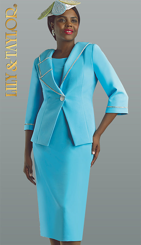 Introducing the Lily And Taylor 4631-BLU Church Suit â a testament to classic elegance and modern sophistication. Crafted with expert tailoring, this two-piece suit is a must-have for any wardrobe catering to formal events, church gatherings, and celebrations where making a stylish statement is key.