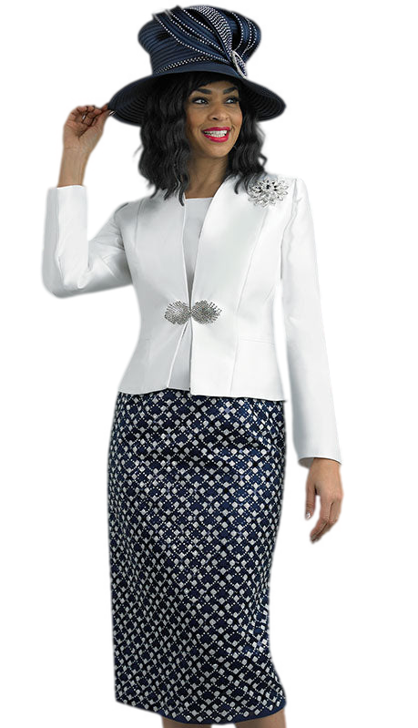 Introducing the Lily And Taylor 4653-NVY Church Suit, a stunning ensemble designed for women who appreciate elegance and style in their formal attire. This sophisticated outfit is ideal for church gatherings, weddings, and other special events where making an impressive fashion statement is key. The navy blue and white patterned skirt provides a striking contrast, while the classic peplum jacket adds a touch of timeless grace.