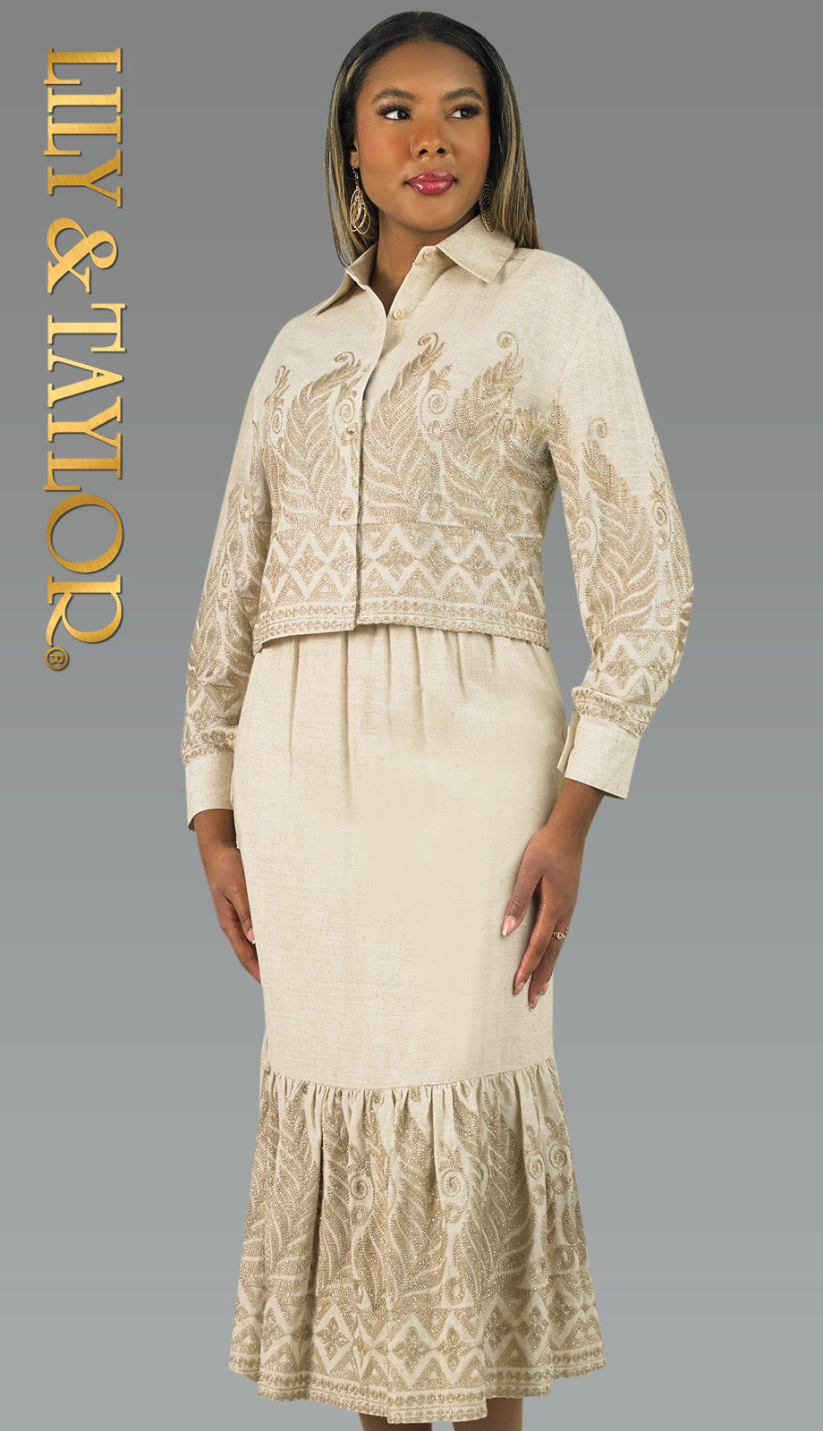 The Lily And Taylor 5050-GLD is an elegant two-piece ensemble that perfectly balances comfort and style. This stunning outfit includes a sophisticated shirt and an exquisite skirt, designed to make you stand out at any occasion.