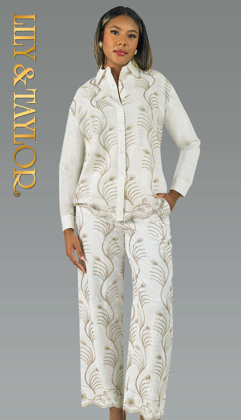 The Lily And Taylor 5051-GLD is a stunning outfit that blends elegance with comfort. Made from high-quality fabric, this ensemble features intricate embroidery that adds a touch of sophistication. The design showcases a timeless style with a modern twist, making it perfect for both formal and casual occasions.
