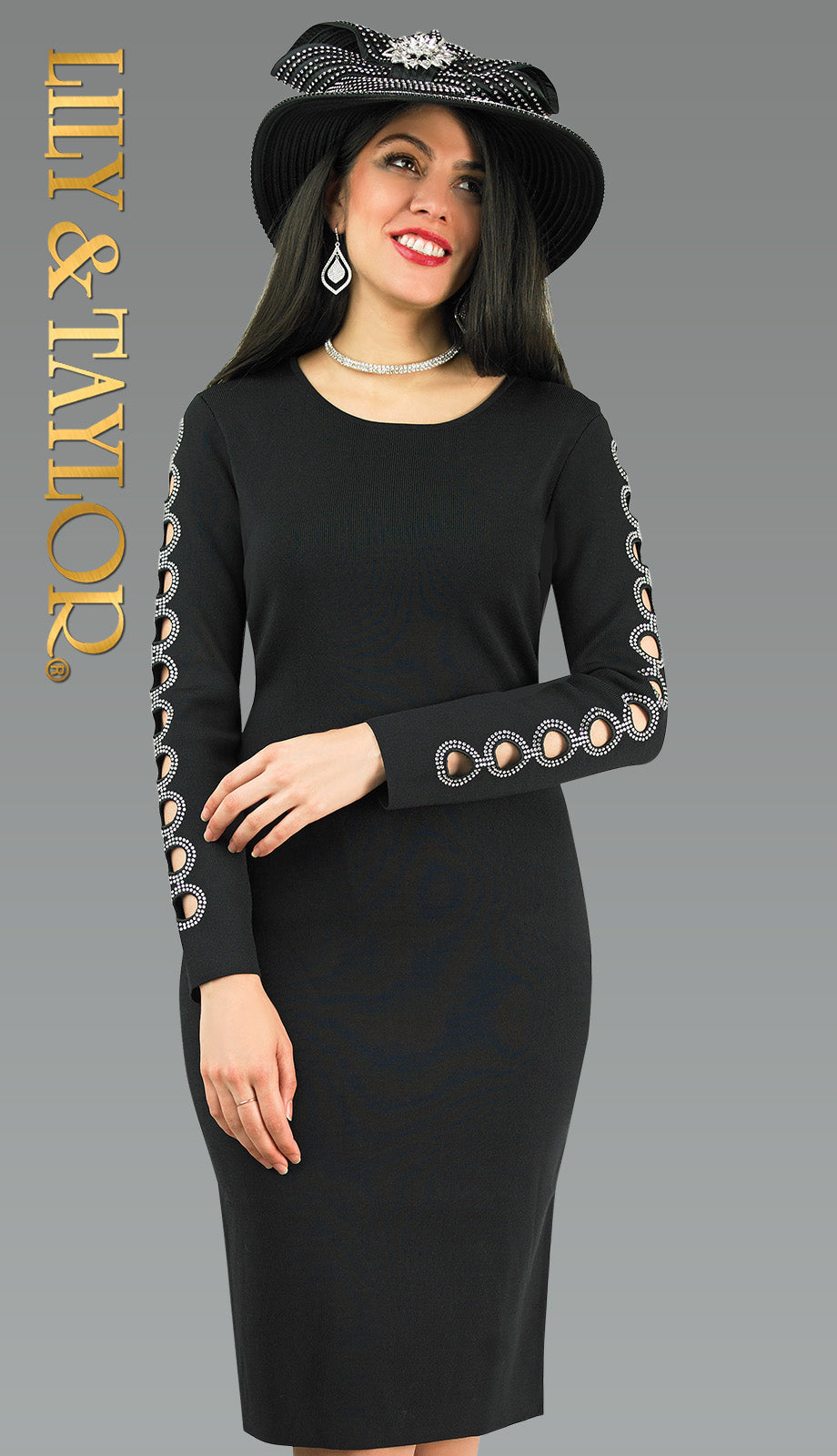 Introducing the Lily And Taylor 817-BLK, a testament to timeless elegance and sophistication. This exquisite knit dress is a perfect blend of grace and comfort, making it an ideal choice for church gatherings, elegant luncheons, and other formal occasions. Crafted from a breathable knit fabric, it ensures comfort without compromising on style, allowing you to move with ease and confidence throughout your day.