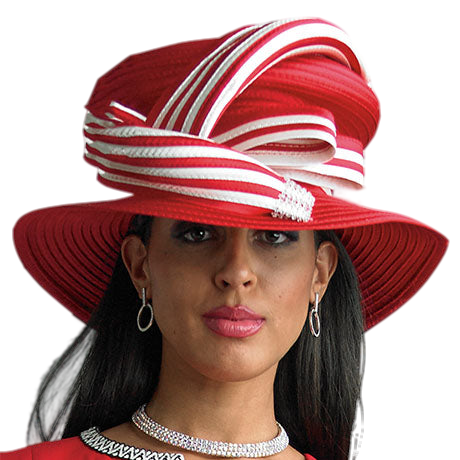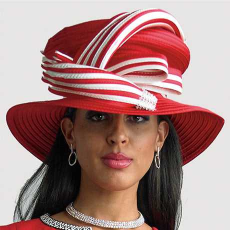 The Lily And Taylor H1002-RWI Church Hat is a statement piece that exudes class and sophistication. Meticulously designed with a vivid red base adorned by white decorative stripes, this unique hat offers a stunning visual contrast that will turn heads in any congregation or event. Not only is it fashionable, but it also provides practicality with its wide brim that ensures you're protected from the sun's rays, merging style with function seamlessly.