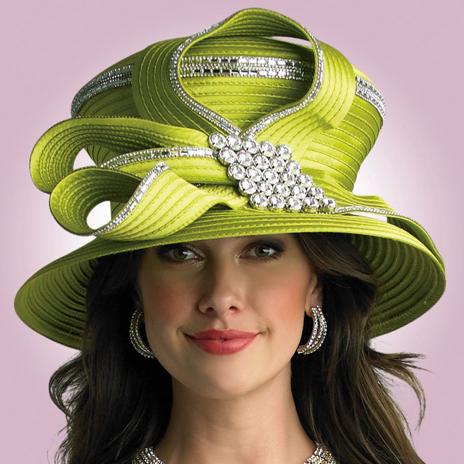 Introducing the Lily and Taylor Hat H118-APPLE, a breathtaking accessory that complements any outfit with a burst of vibrant color and sophisticated design. Crafted with an eye for detail, this hat features a unique apple green hue that is both lively and elegant, ensuring you capture attention at any event. The swirling layers of fabric artfully create a sense of movement and depth, while the strategically placed rhinestone embellishments add that perfect touch of sparkle, balancing the zest of color with a shimmer that catches the light beautifully.