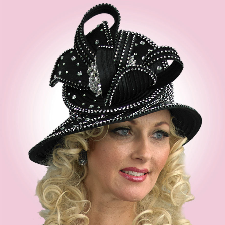Introducing the exquisite Lily and Taylor Hat H950-BLK, a stunning piece of fashion that speaks volumes of elegance and class. Crafted with precision, this hat features a bold black palette that makes it versatile enough to match a myriad of ensembles while also standing out as a statement piece. The timeless design is elevated by the addition of sparkling rhinestones, meticulously placed to catch the light and add a touch of glamour to any outfit.