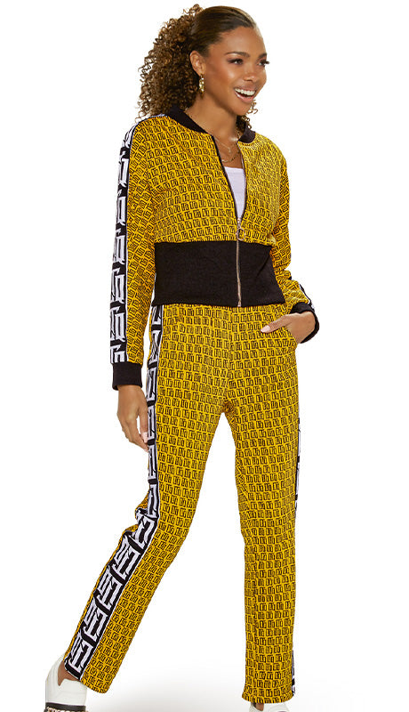Introducing the exquisite 'Love The Queen 17382 Church Jacket and Pant Set', a blend of elegance and modern style. This sophisticated ensemble is a testament to the fashion-forward woman who appreciates a vibrant look with a touch of classic flair. The jacket and pant set features a captivating yellow hue, emboldened by a unique geometric pattern that exudes confidence and grace.