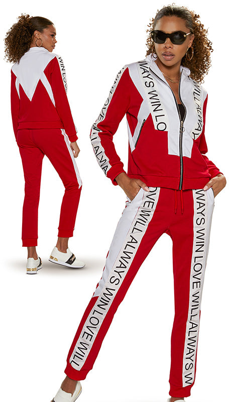 The jacket flaunts a sleek zip-up front and relaxed collar, ensuring ease of wear while providing ample warmth and coverage. The elegant design is heightened by the inclusion of functional front pockets and distinctive side stripe detailing that features an empowering slogan. Such thoughtful details emphasize the set's unique character and strong fashion statement. Paired with the matching pants, which boast the same eye-catching side stripes and a comfortable elastic waistband, the ensemble is versatile enough to be worn to a variety of events, from church services to casual brunches.