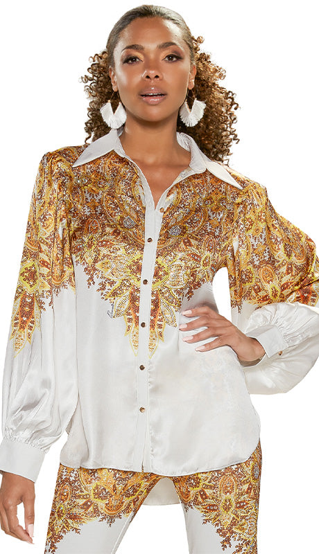 Introducing the Love The Queen 17389-T Church Top, a masterpiece of fashion that blends style and comfort for the modern woman. This top is designed keeping in mind the elegance required for church gatherings and formal events. A luxurious paisley pattern embellished with shimmering gold accents adorns the borders of this beautiful piece, adding a touch of royalty to your wardrobe.