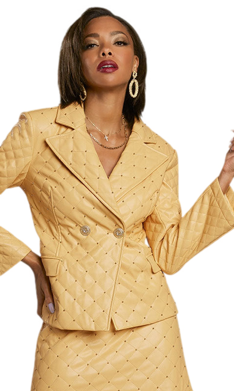 Its opulent gold-tone hue brings a regal essence to the ensemble, perfect for those who wish to make a statement with grace and poise. Complemented by ornate button detailing, the jacket fastens in a way that enhances the figure while exuding elegance. The structured collar lays beautifully, framing the face and completing the distinguished look.