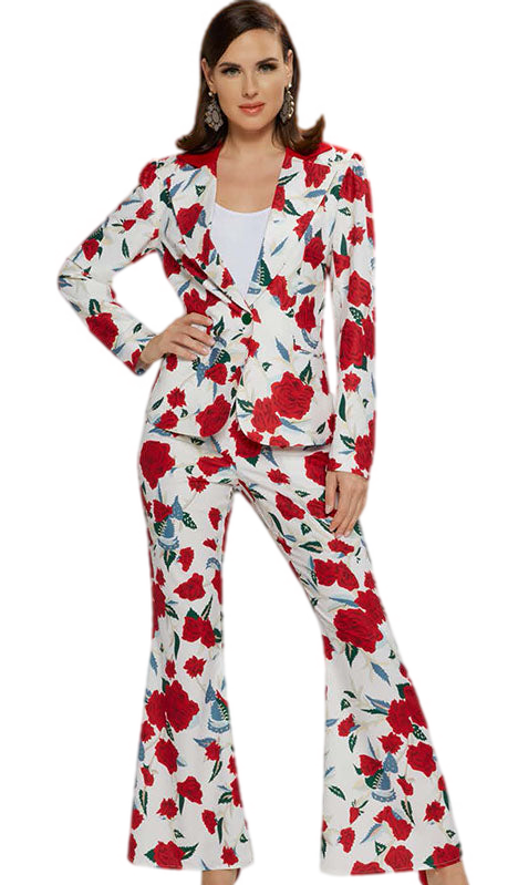 Introducing the Love the Queen 17462 Set, a stunning ensemble that exudes both elegance and contemporary style. This bespoke two-piece set is designed with a bold floral print pattern, showcasing vibrant red roses on a crisp white background, making it an ideal choice for those who wish to make a statement with their wardrobe.