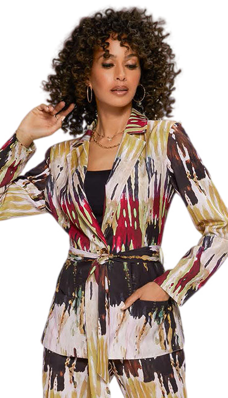 The jacket features an eye-catching abstract print that is sure to turn heads wherever you go. The print's unique blend of colors adds a dynamic energy to your outfit, making it a centerpiece garment for any ensemble. A tie-waist detail cinches the waist, offering a custom fit that flatters the figure and accentuates your silhouette.