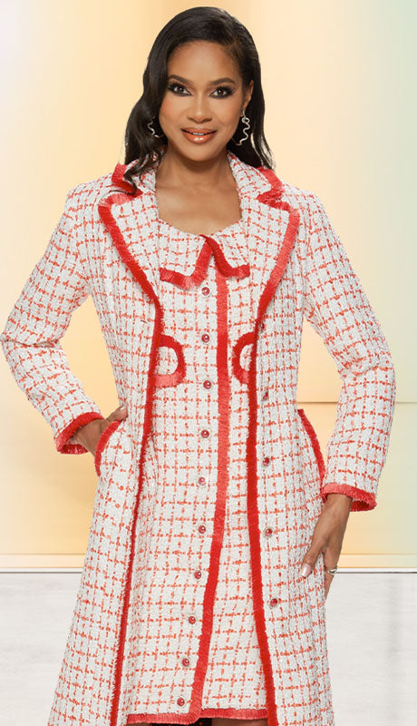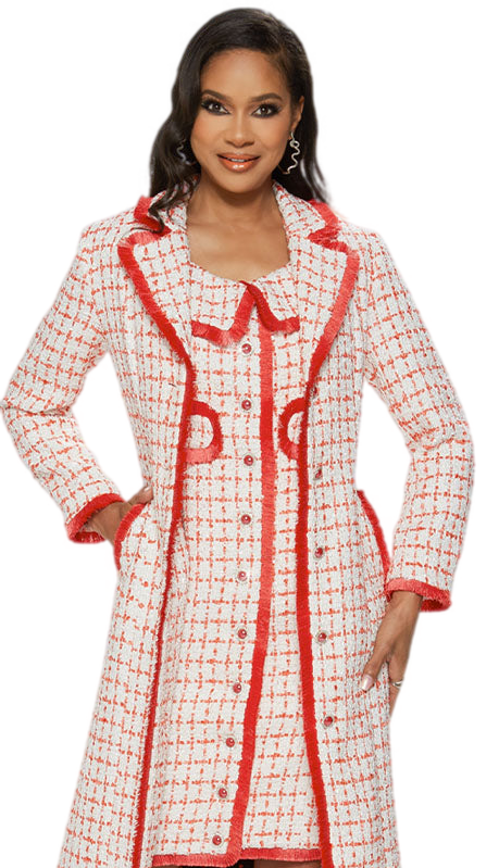 Introducing the Love the Queen 17482-J Jacket, a timeless piece that exudes class and sophistication. This knee-length jacket is crafted from an exquisite tweed fabric that delivers both comfort and style. Its classic design is elevated by the striking red trim that outlines the jacket, lending it an air of regal elegance. Every detail is meticulously fashioned, from the full-length sleeves that provide warmth to the feminine collar that adds a touch of unique character to the silhouette.