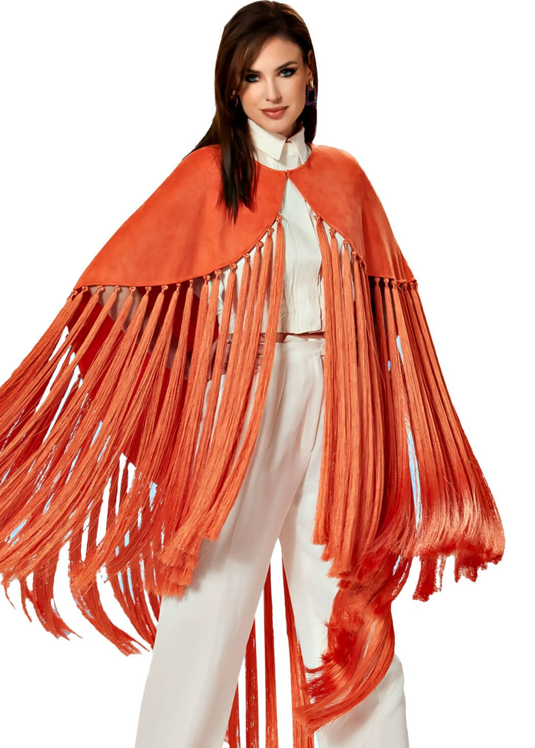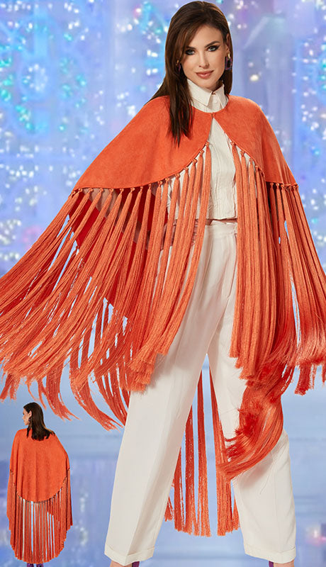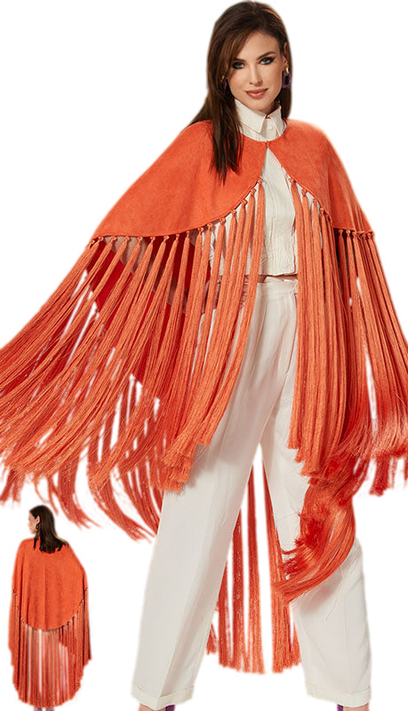 Introducing the captivating Love the Queen 17492 Cape, a piece that exudes both elegance and contemporary charm. This stunning cape comes in a vibrant tangerine hue that is both eye-catching and on-trend, perfect for making a statement at any event. The luxurious fringed design adds an element of texture and movement, creating an alluring silhouette that sways gracefully with every step.