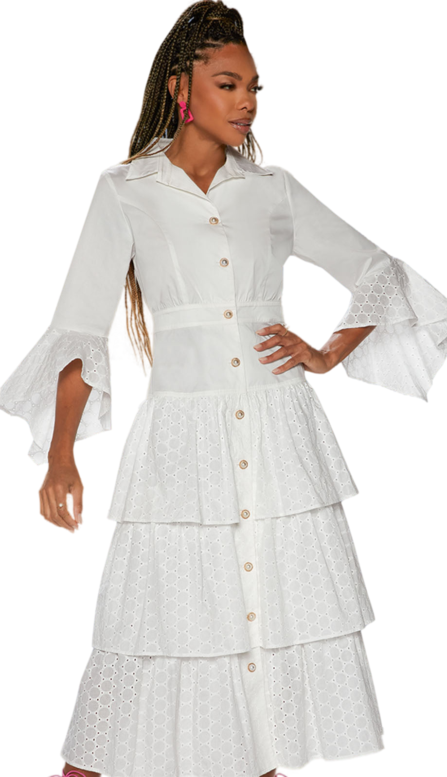 The visual intrigue continues to the sleeves, where you'll find charming bell shapes accented with eyelet trim, adding a touch of whimsy and feminine flair to the overall design. The front of the dress includes a button-up closure, which not only allows for easy wearability but also adds a timeless detail that complements the entire look.